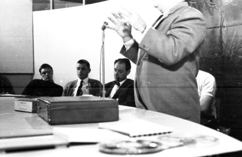 Students: Al Treacy and John Rush listen to Bucky with John McHale