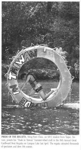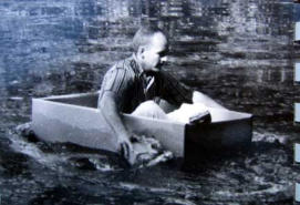 Cardboard BoatsIn the late 1950s Bucky started building domes our of folded cardboard. The “Experimental Freshman Year” program used corrugated cardboard to construct study carrels. Each carrel had a cardboard desk and a director’s chair.In 1962, design students in the senior class were assigned a project to build a cardboard boat that would transport a person 100 feet. Grant MacLaren has posted the original problem statement and a number of photographs at: grantmaclaren.comAnother class problem, a couple of years later, was to build the tallest structure possible using two sheets of corrugated cardboard. Problem solutions were so tall they had to be constructed outdoors. Students who pulled an all-nighter watched as their towers went limp in the morning dew.