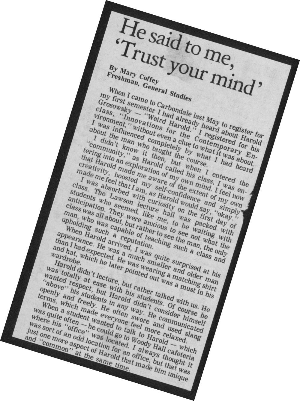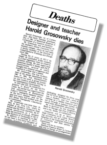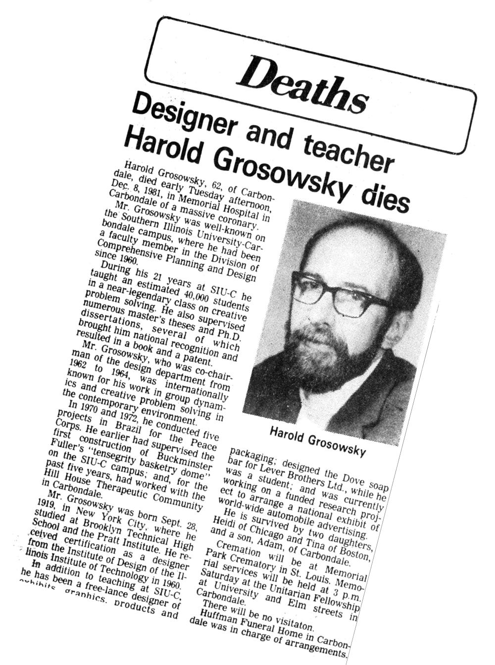 Harold Grosowsky • “Mr. G.”Harold came to Southern Illinois in 1960 from the Institute of Design in Chicago.He came into his own a few years later as the instructor of the General Studies 205 Design class.205 reached a broad audience with it’s large lectures, 3-screen slide-tape presentations, and well designed classroom structure.Mr. G. stories are endless. Most of them feature Harold teaching a student to think for him or herself. He was known for his sailor caps, his beard, and humor.