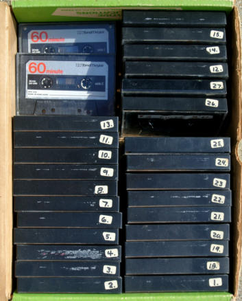 The Design 205 class that Mr Grosowsky taught was a multi-media production. At least one class session each week featured a three screen slideshow. Three Kodak Carousel projectors loaded with 35mm color slides were syncronized with an audio tape recording playing through the auditorium sound system. The image above gives the flavor of this early multi-media system. The image to the right shows one of the last remaining sets of cassette tapes for the GS-205 class.