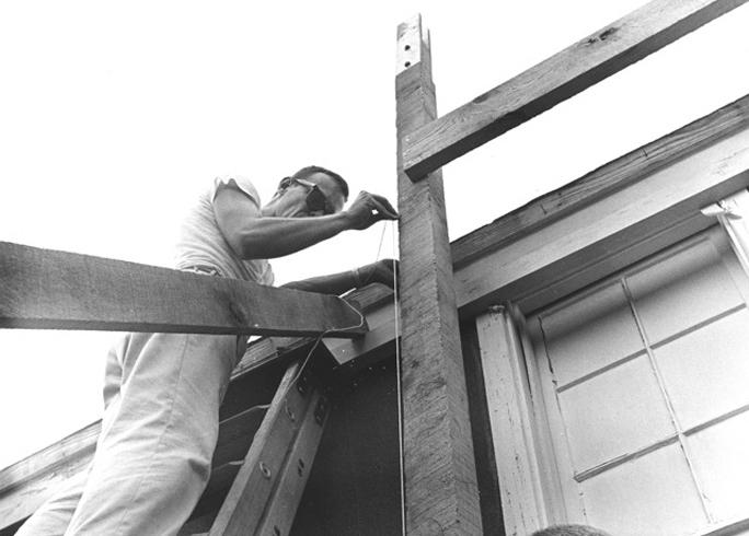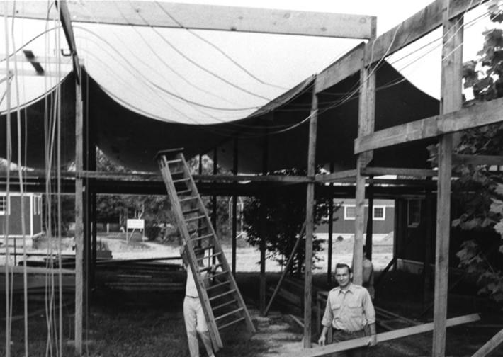 Photo by Dale Carlson - abt 1965 MEMO Why Homasote?   Because: 	1.	it was available in a HUGE sheet size (8 by 14 feet),  	2.	it was flexible,  	3.	it was reasonably water resistant and durable,  	4.	it was inexpensive,  	5.	shipping point was proximate, and  	6.	my budget was stringent --- one dollar per square foot for the entire enclosure to include pavement and heating.  One dollar/sq. ft. was accomplished, by the way.   The space between wasn't supposed to be in place for more than one or two years. It’s going to be an "experimental structure" is how Harold maneuvered it past the university budget and architects' offices.    In fact, the space between lasted, serving very nicely, with occasional improvements, for more like 7 or 8 years.”  Herb Meyer photo by Dale Carlson Herb Meyer